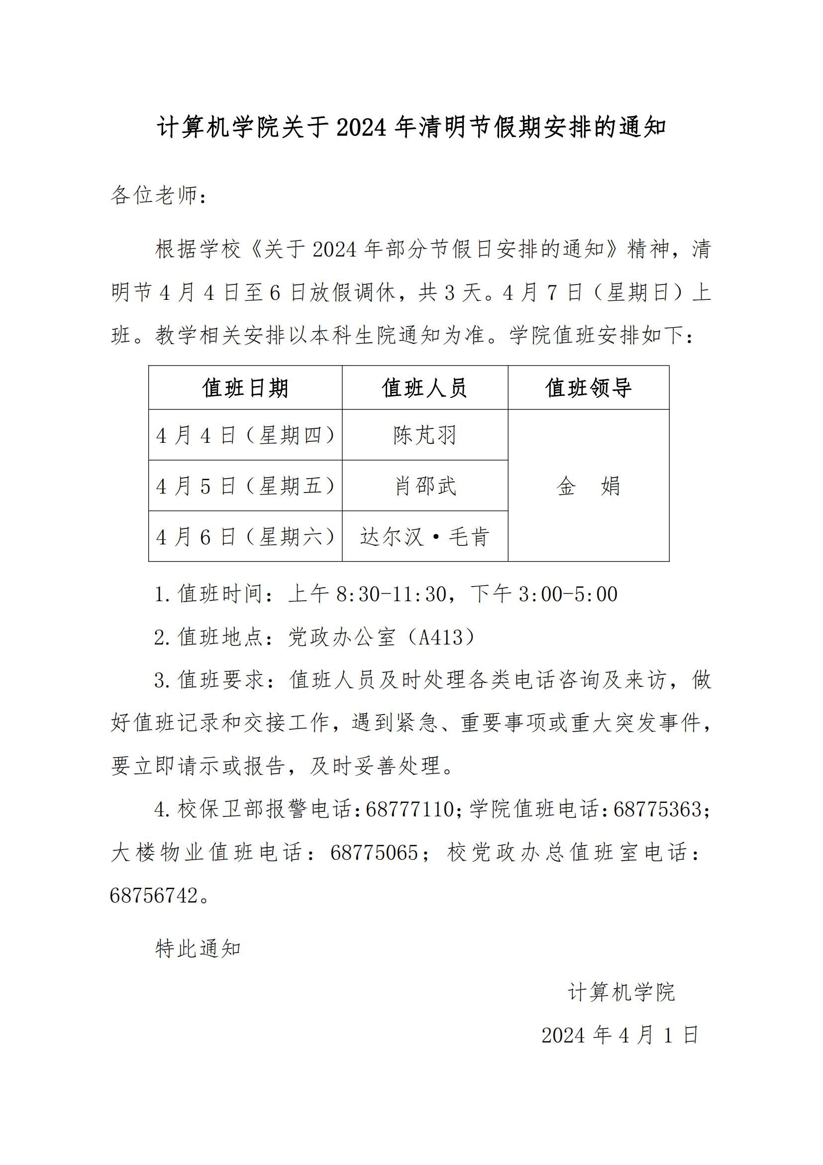计算机学院K体育·(sports)官方网站2024年清明节假期安排的通知